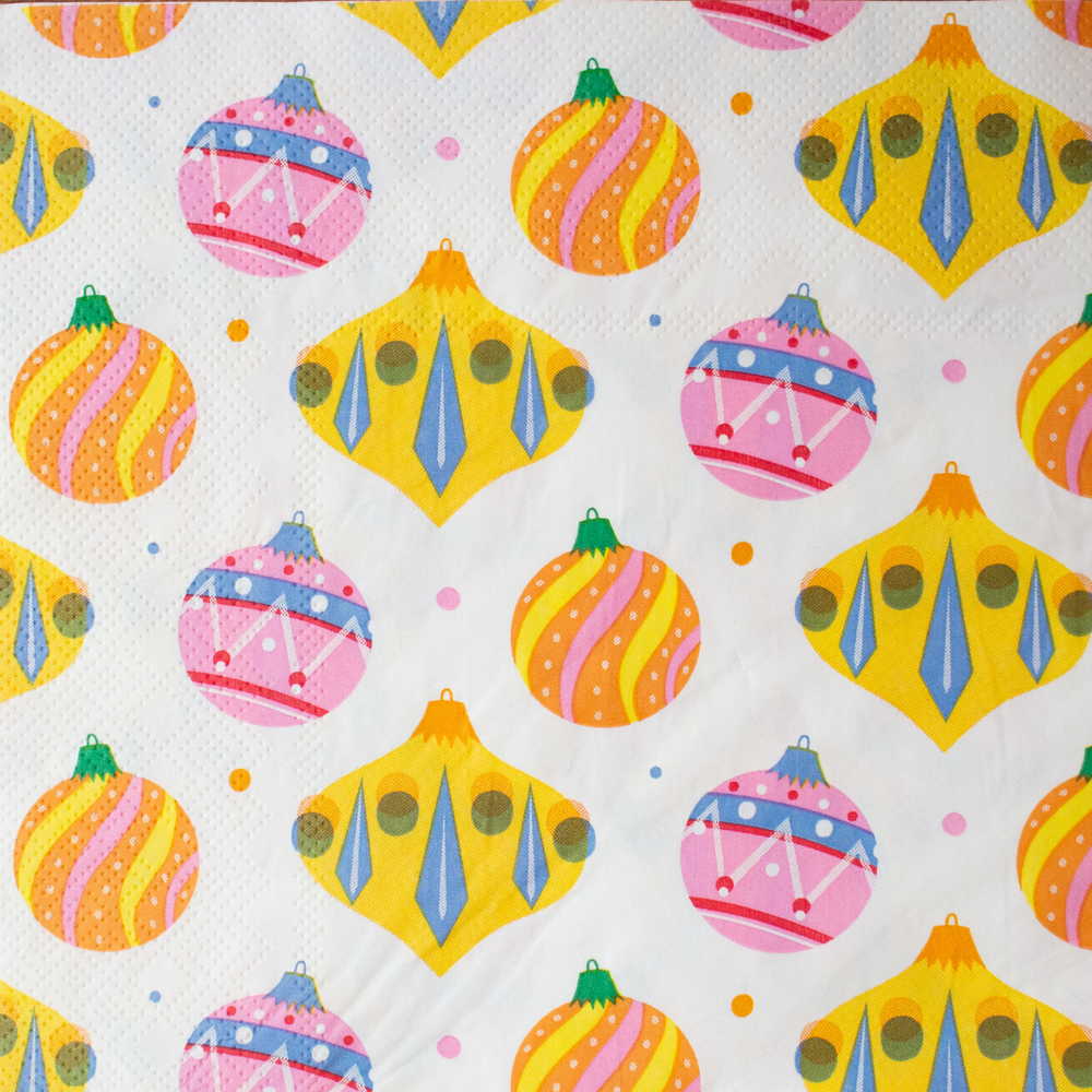 Add festive cheer to your seasonal table with our Baubles Christmas paper napkins, featuring a joyful, contemporary design by UK-based independent illustrator Jade Wheaton. These vibrant 3-ply napkins are perfect for seasonal gatherings, Christmas parties, or winter gifting.