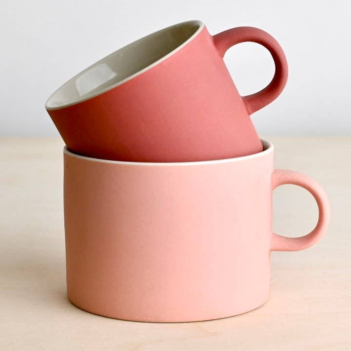 Wide straight sided mug with minimalist rounded handle. Perfect for milky coffee or hot chocolate