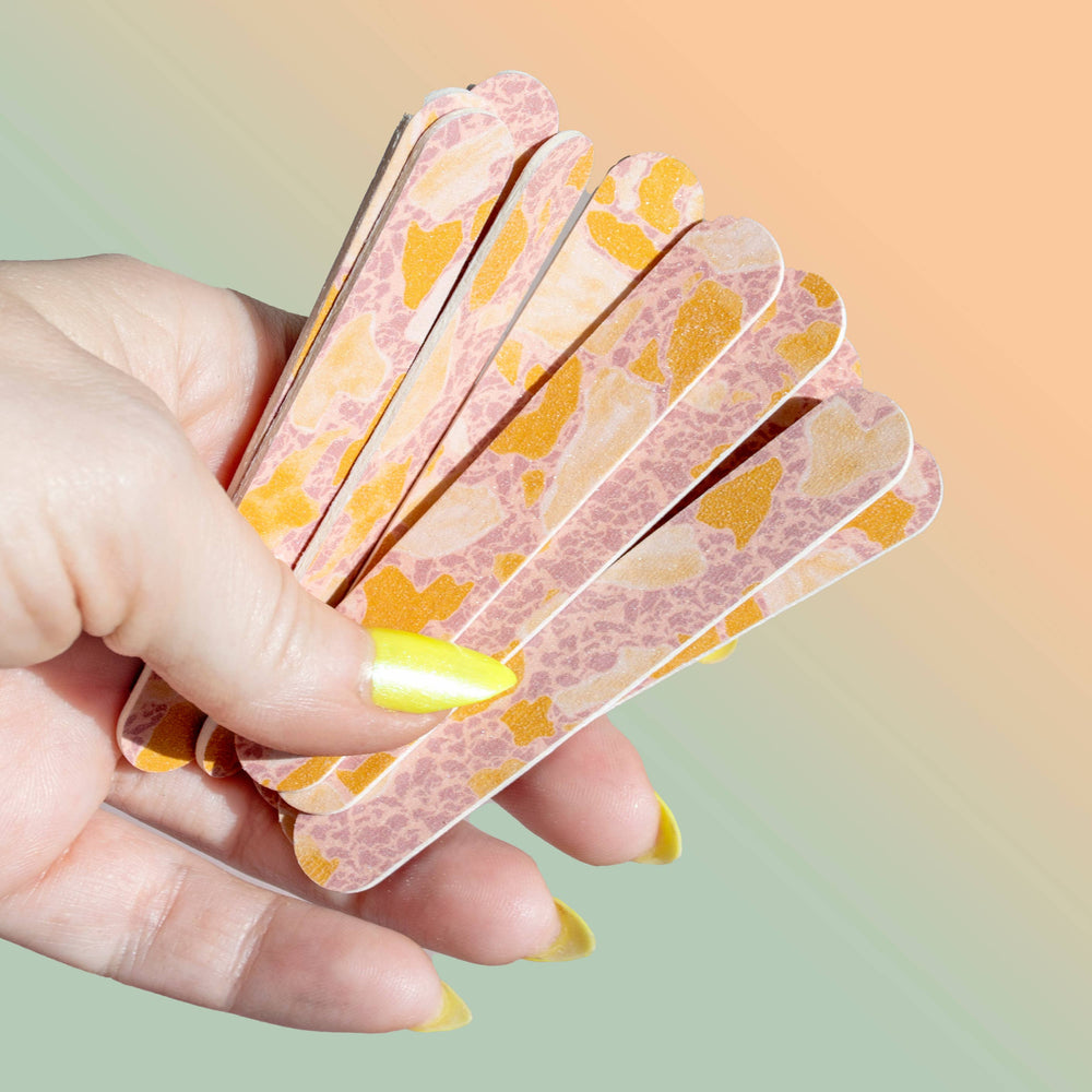 Limited Edition design! Pack of 10 mini nail files. These plastic free files are made from an eco friendly wood base. Files are double sided, course for shaping and fine for smoothing.