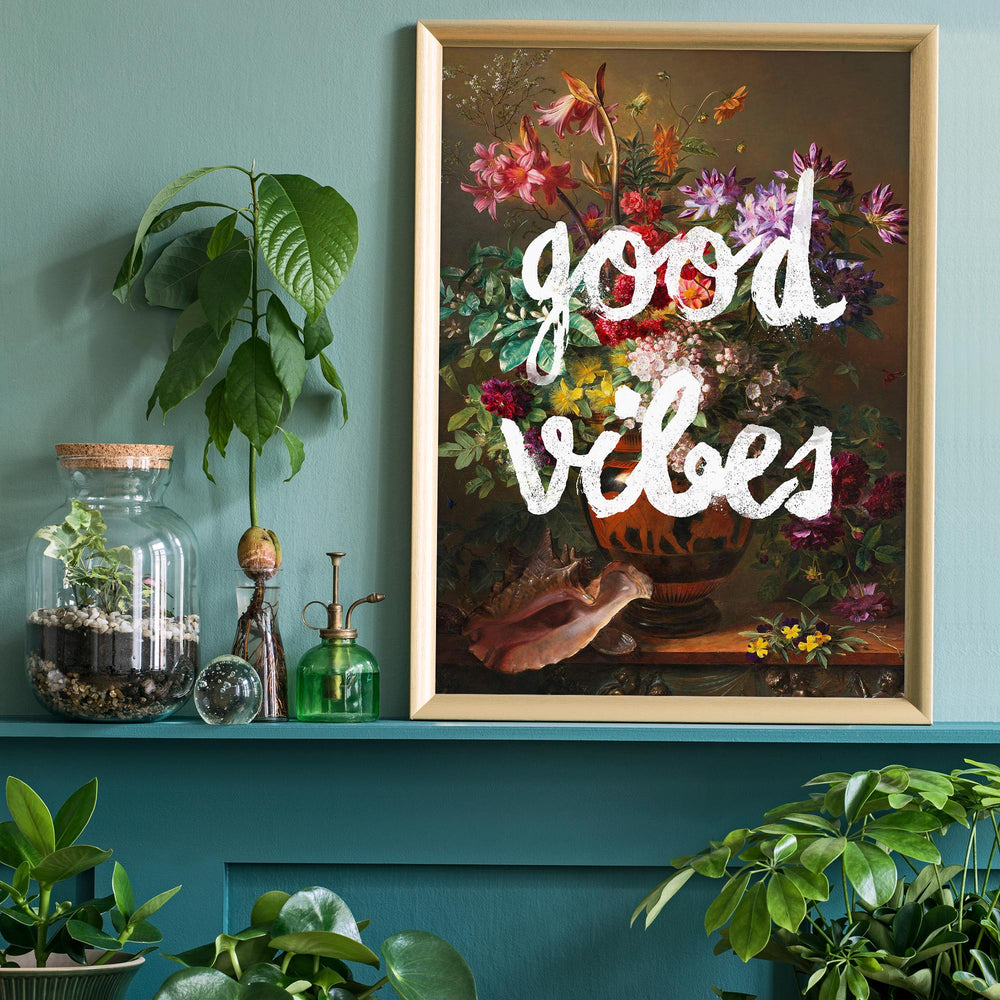 Good Vibes! Old flowers painting with graffiti writing. This urban art style print depicting a classic image but with a cheeky twist, has been reproduced onto high quality archival fine art paper. This Quirky Art Print would look amazing as part of a boho style interior, either as a large framed print or part of a gallery wall in your living room.