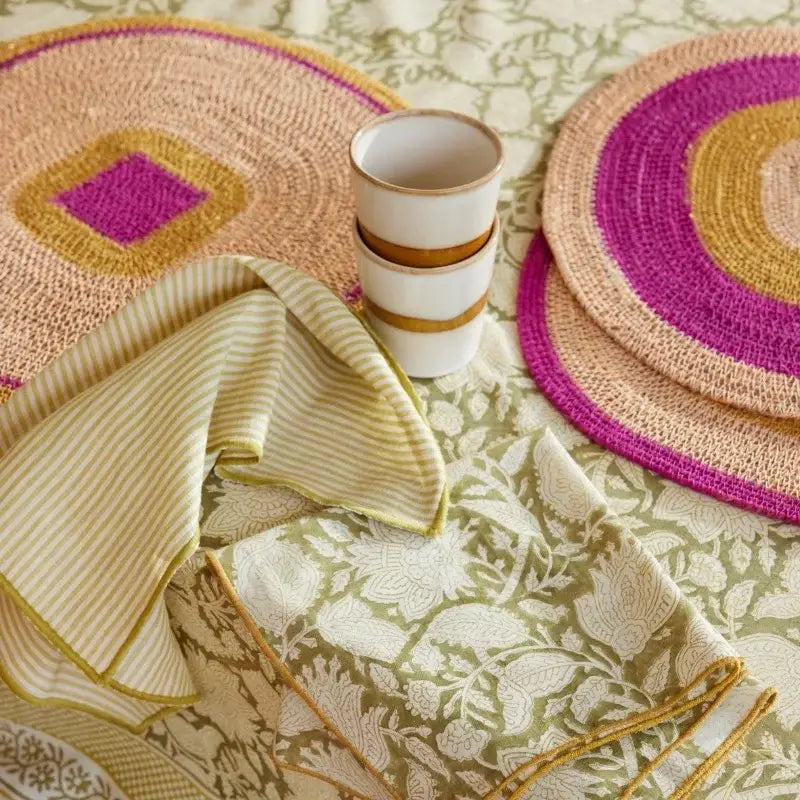 Raffia table mat with bohemian stripes. We love these table mads designed with the natural raffia and entirely handmade. The craftsmanship and its bright palette give it a bohemian spirit that we love at Bonheur du Jour. So practical and so pretty, these table sets will brighten up your moments with family and friends... We love its "rounded square" dimension that makes it unique.