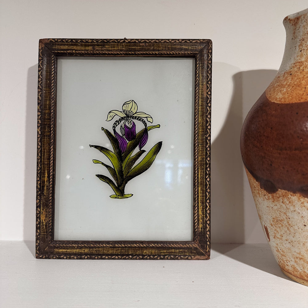 Hand painted botanical or wildlife imagery with glass and a vintage wooden frame. These enchanting pieces are each completely unique.