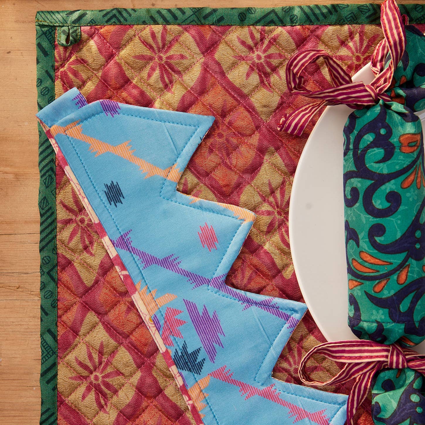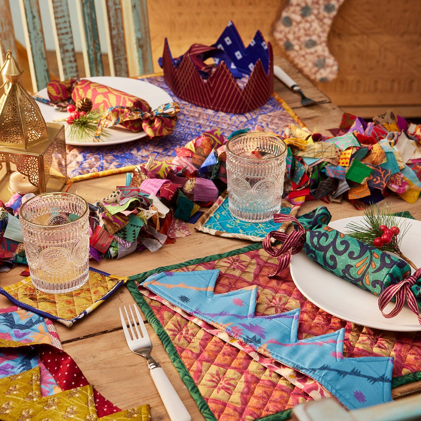 Celebrate Christmas and other special occasions with an eco friendly, reusable crown hat. This reversible design features unique recycled sari prints on each side, allowing you to switch up your look with two hats in one!