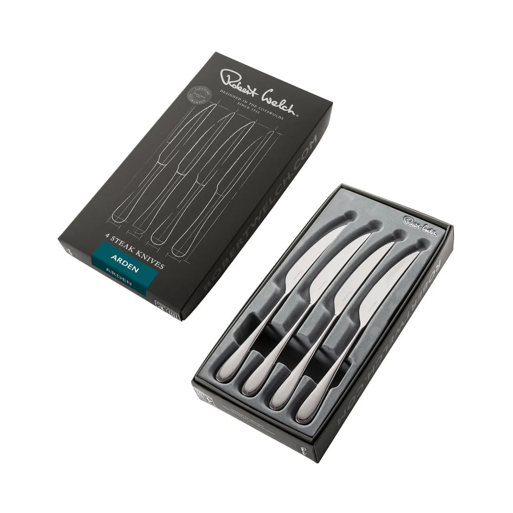 A 4 piece, gift boxed steak knife set from the graceful, award-winning Arden cutlery range. Made from specially hardened stainless steel with a mirror-polished finish.