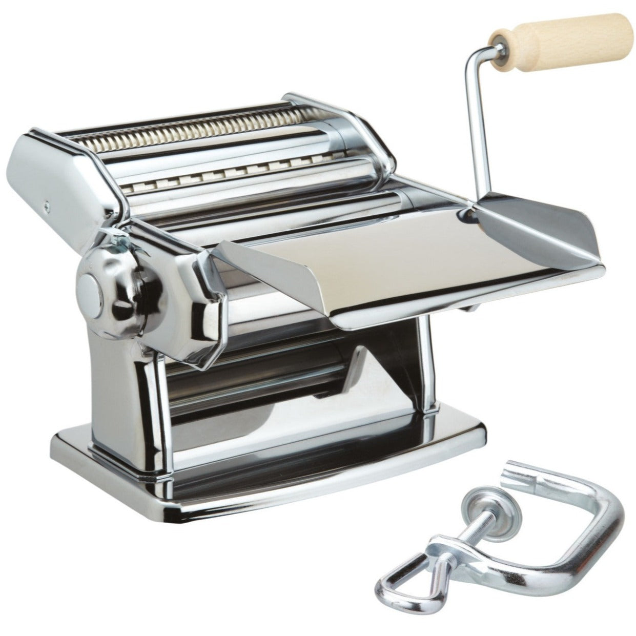 The Imperia Italian SP150 Pasta Machine is made with heavy duty chrome-plated steel and includes a duo-cutter to make three varieties of pasta; lasagne, fettuccini and tagliatelle. An adjustment dial allows the pasta to be produced in up to six thicknesses. The machine also features a detachable wooden handle for easy storage and a tabletop screw clamp fitting for added stability and control when in use.