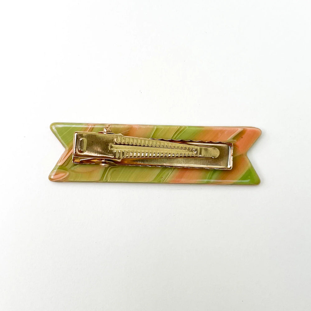 • 'Weirdo' : Puke green swirl cellulose acetate with white cursive ink inlay and a gold alligator clip on the back.