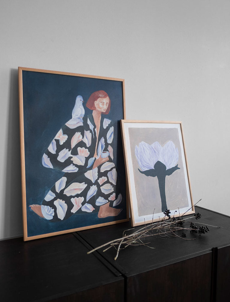 Letting the shell pattern cover the clothes creates an ambiguity in the motif. Humor is mixed with seriousness. The womans position fills the picture, she is strong and vulnerable at the same time. The pattern is both a defense and a fragility. Original painting with acrylic.