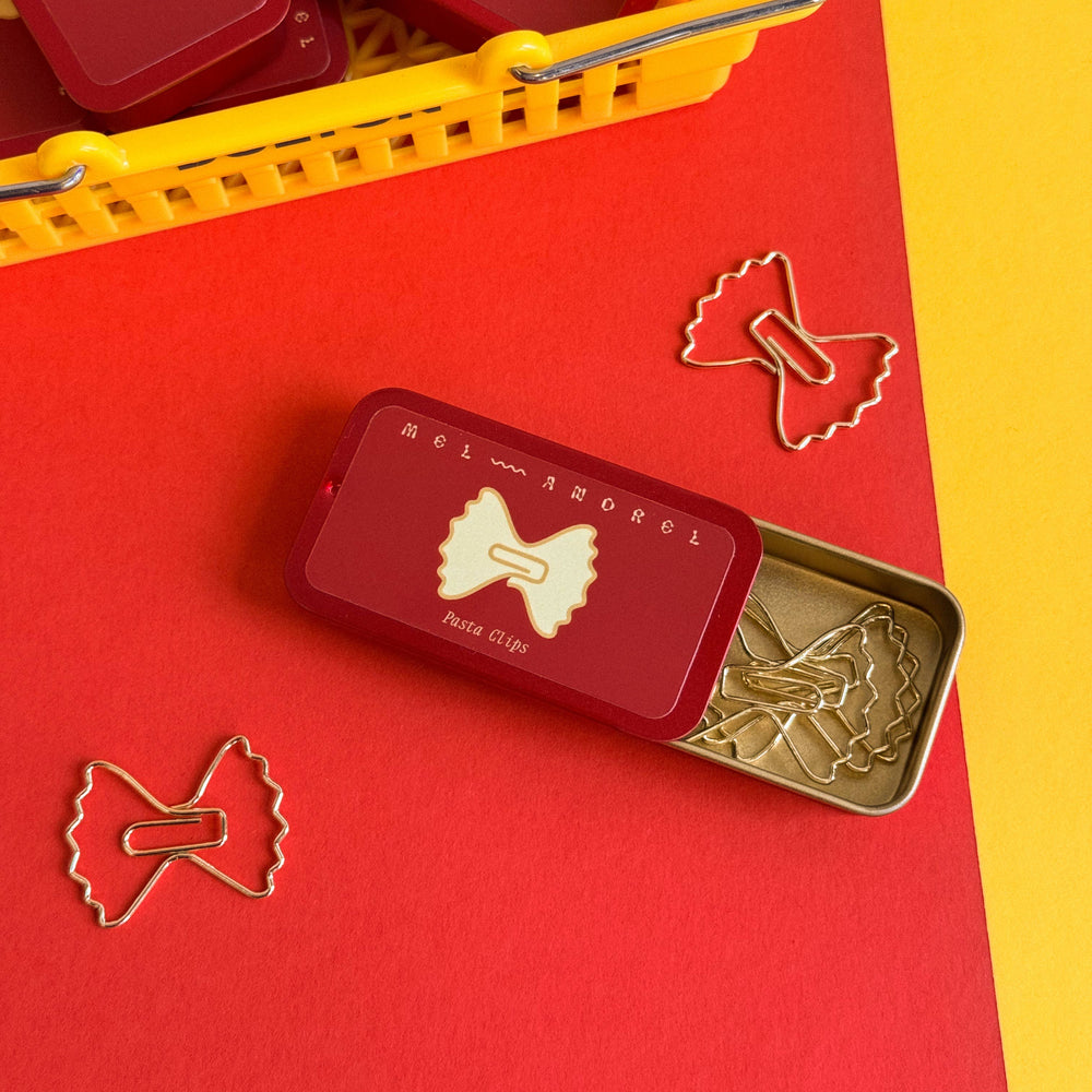 Set of 5 unique and versatile farfalle pasta-shaped gold clips that can be used as paperclips, page holders, or bookmarks. Secure your top-secret documents, bookmark your essentials, and use them for as long as you'd like!