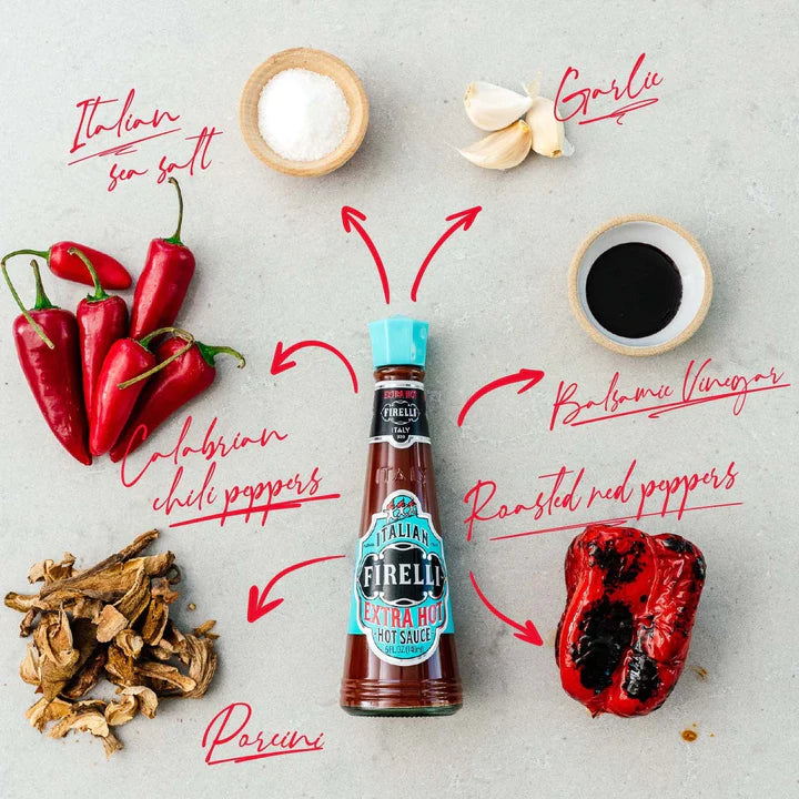 EXTRA HOT Firelli! The same delicious recipe as our "Original" Hot Sauce, with added Cayenne Pepper - for a hot spicy kick. Made in Parma, Italy with Calabrian Chili Peppers, Roasted Red Peppers, Porcini Mushrooms, herbs, spices, Balsamic Vinegar and Garlic. FIRELLI Extra Hot is the perfect hot sauce for someone who loves the heat (Scoville Rating is 4,800 SHU). A perfect present for gourmet chef or Hot Sauce aficianado and a must have for any pantry. Goes perfectly with Pizza, Pasta, Salads, Chicken Wings, BBQ and more.