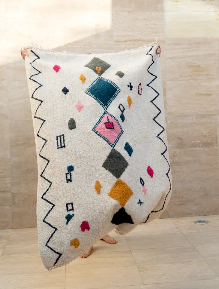 A beautiful graphic rug wit multi-coloured shapes and graphic patterns. Perfect for adding warmth and playful charm to your interior.