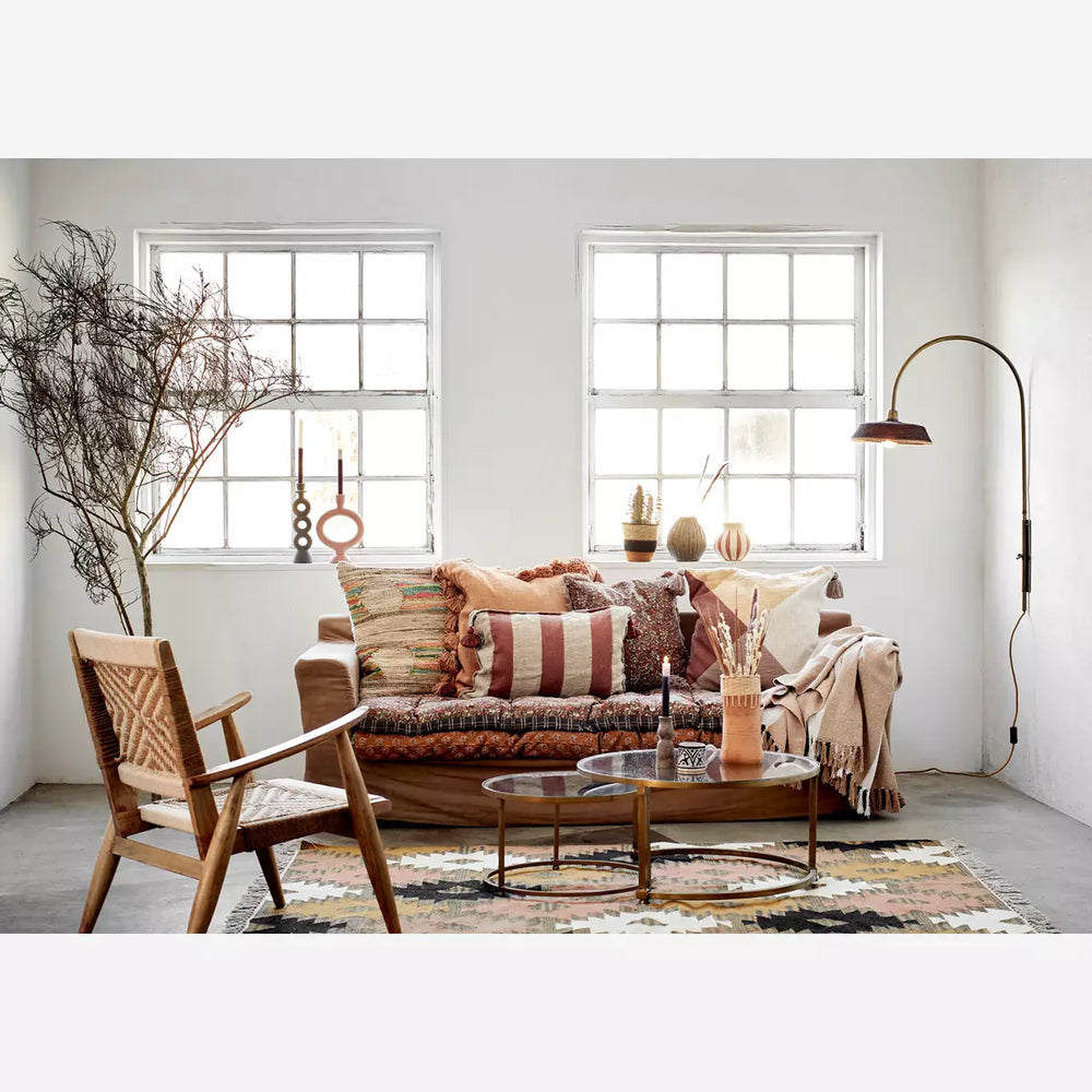 A handwoven rug designed in a traditional bohemian style with diamonds or black, ecru, rust and blush. Perfect for adding a pop of colour to any space.