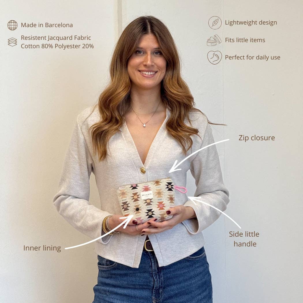 Made in Spain using locally sourced jacquard fabric (80% cotton, 20% polyester), it showcases a warm geometric pattern in pink and orange tones on a soft beige base. The thick woven fabric gives it structure, while the durable grey lining keeps everything protected inside.