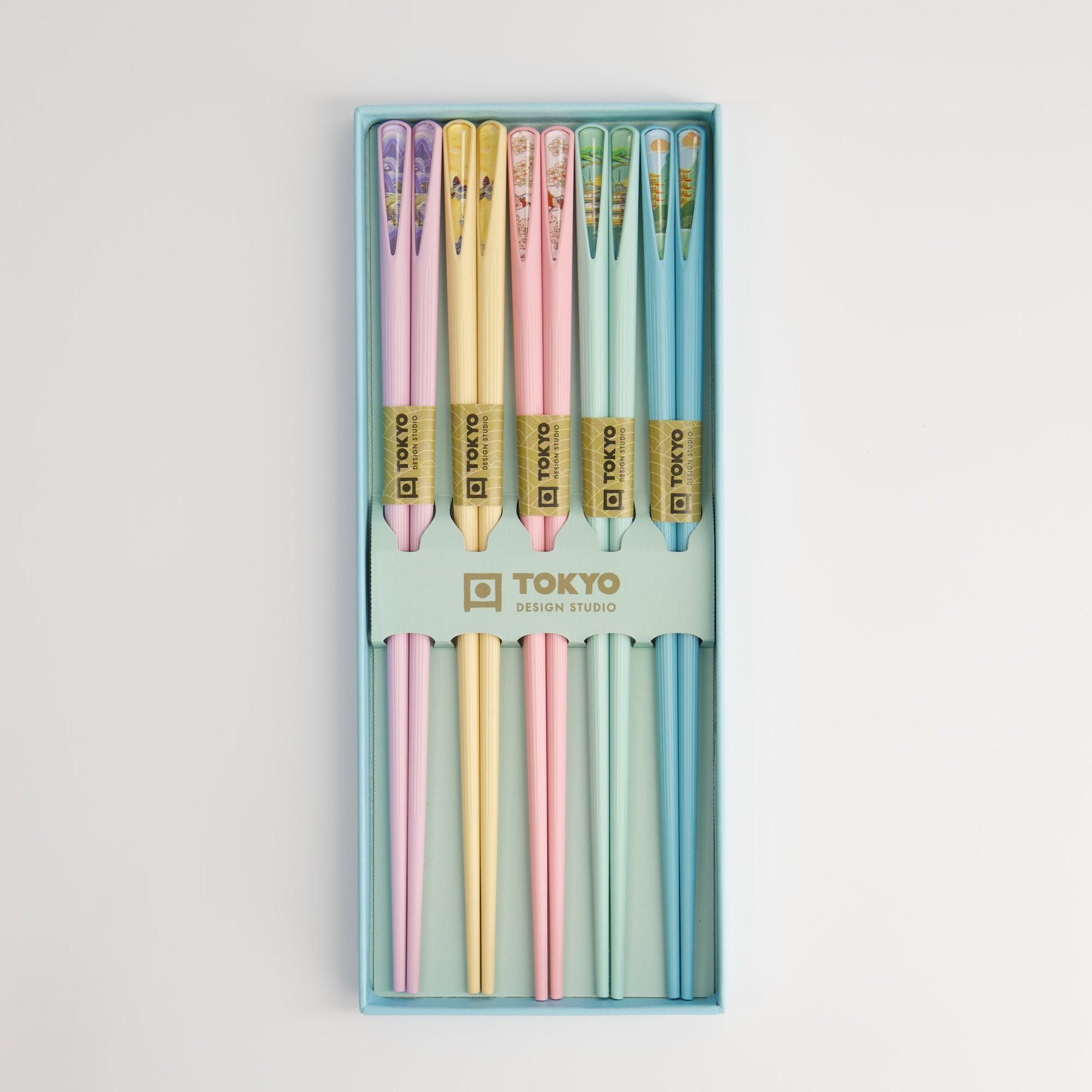 Add a touch of colour and Japanese charm to the table with this beautifully presented set of five chopsticks from Tokyo Design Studio. Each pair features soft pastel tones with delicate illustrated details inspired by traditional Japanese scenes - including pagodas, cranes, and tranquil landscapes.