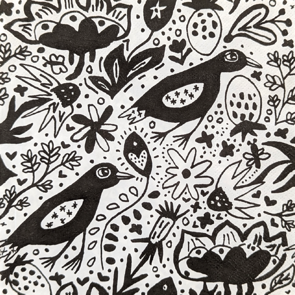 Make a striking statement with our Folk Birds paper napkins, featuring a unique black and white hand-drawn design by UK-based independent artist Rebecca Joy. This pattern of birds and flowers blends traditional folk art inspiration with contemporary minimalism, perfect for adding a bold, artistic touch to any table setting. Each pack contains 20 napkins, plus one additional napkin at the front replacing a plastic cover — a plastic-free and eco-conscious choice.