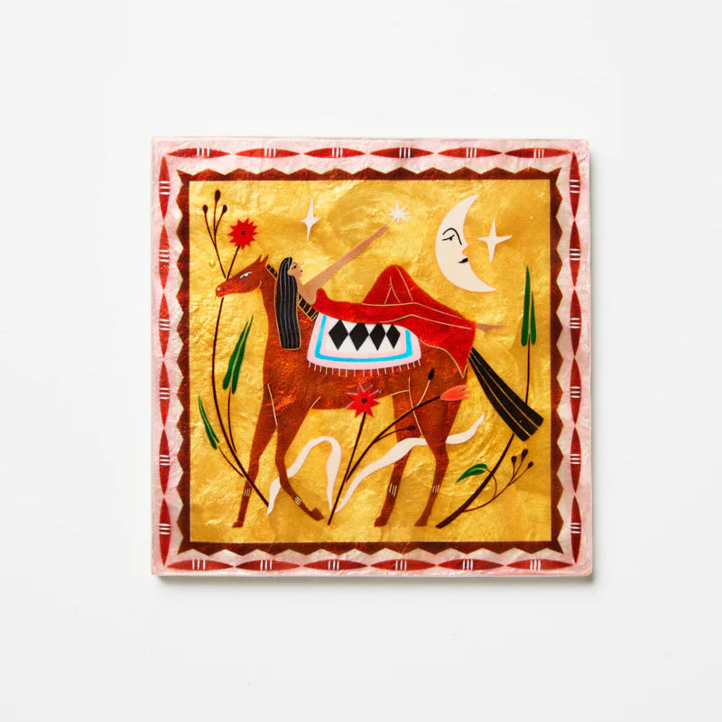 A dreamy tale in tile form. The Fable Horseback Pink Square features a hand-painted rider under the wistful moon, framed in desert pinks and gold. This square capiz wall tile feels like a moment from a storybook, captured mid-gallop.