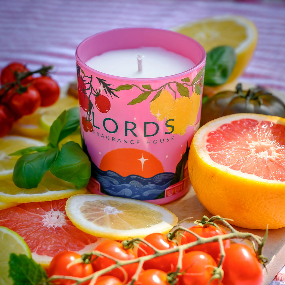 Blending zesty citrus with fresh herbs and green tomato vines atop soft moss and water blossoms. This scented candle was inspired by the picturesque town on the Amalfi Coast, where delicious meals are finished with a sip of limoncello as the sun sets over the Tyrrhenian Sea. Now in an extra special glass, with hand drawn artwork by a British artist.