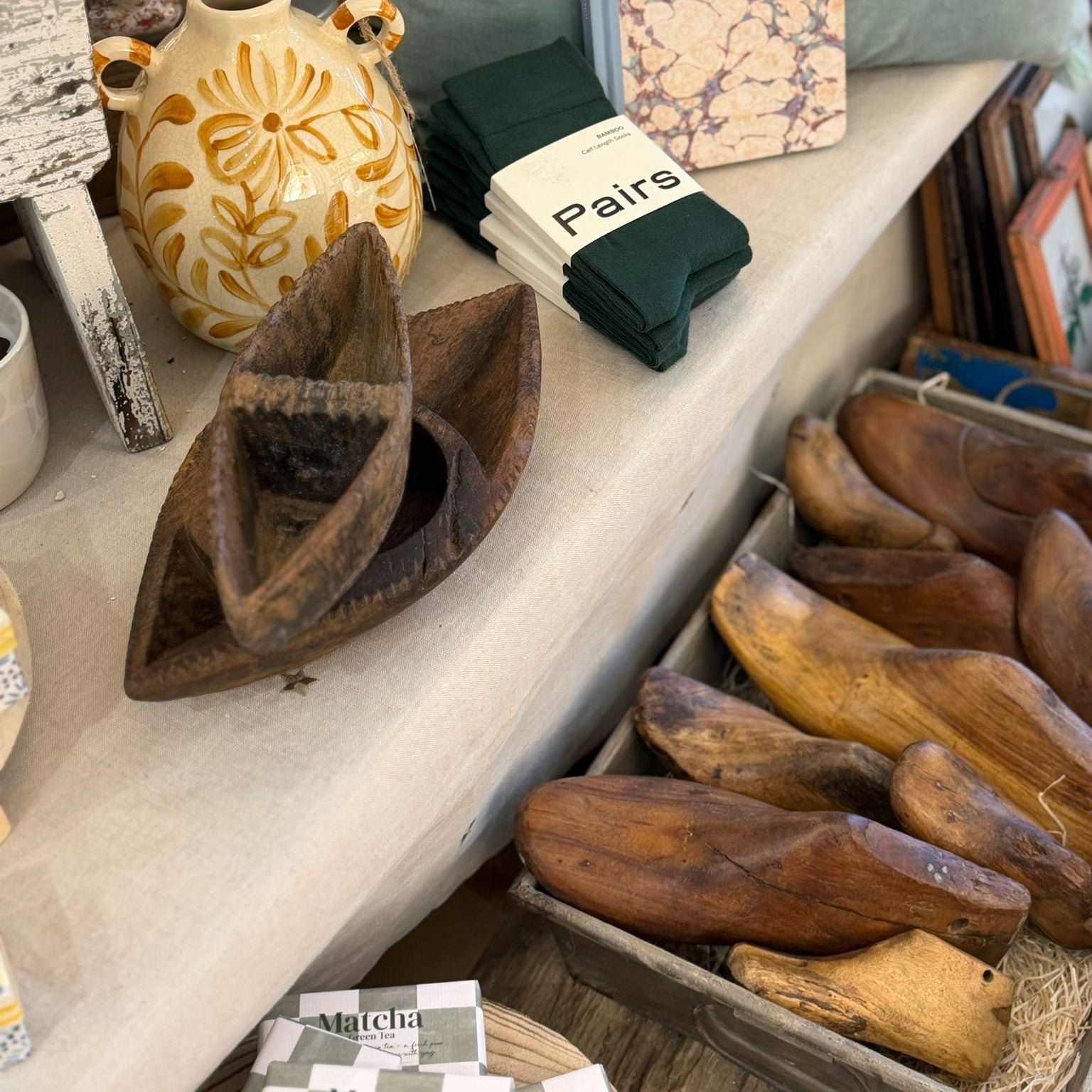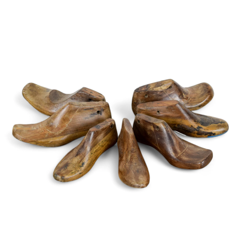 Authentic vintage wooden shoe lasts, once used by cobblers and shoemakers to shape and craft footwear.
