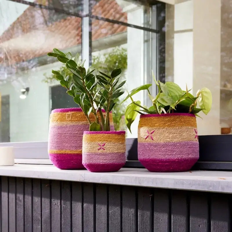 Bohemian baskets woven from seagrass. We love these bohemian-style baskets for their 100% natural material. These baskets have been handwoven using artisanal techniques, making them "unique" and enhanced with fancy stripes in subtle colors unique to our bohemian brand. We have also sometimes added "hand" embroidery that is the DNA of our brand. This lovely range of baskets, rich in color, patterns, formats, and details, will bring a colorful and bohemian touch to your interior. To be used as a catchall or plant cover,