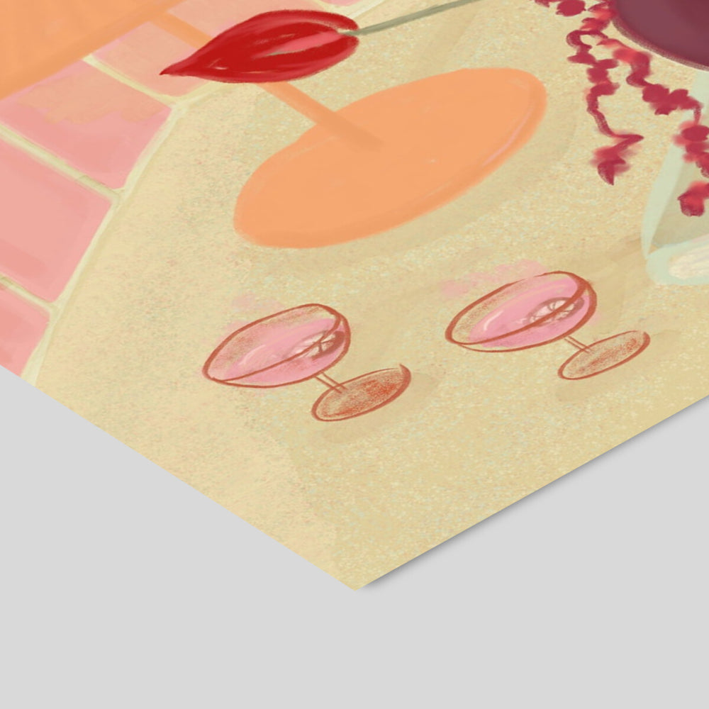 A playful print by Katharina Puritsche featuring glasses of bubbly alongside flowers and pink tiles.