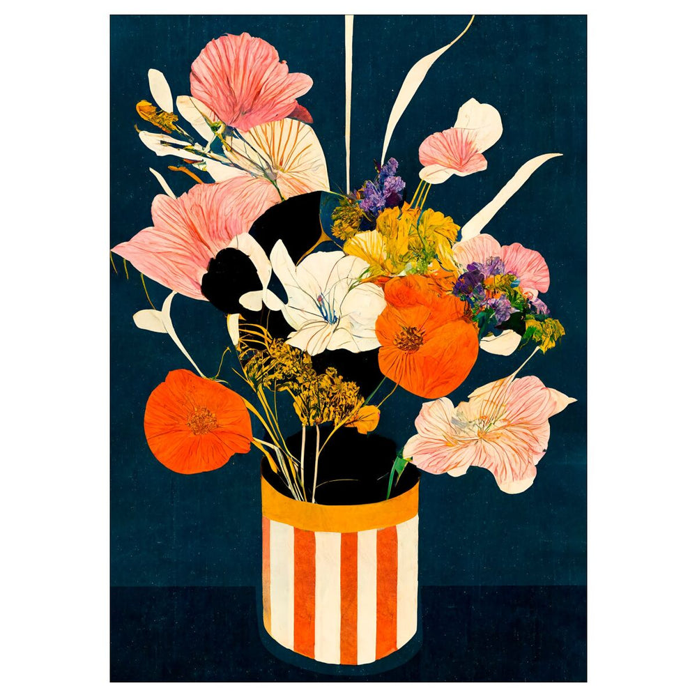 "Flowers at Night" by artist Treechild is a captivating collage poster featuring a bouquet of vibrant flowers in a white and orange striped vase. Against a dark blue background, the colors of the flowers truly pop, creating a striking contrast.