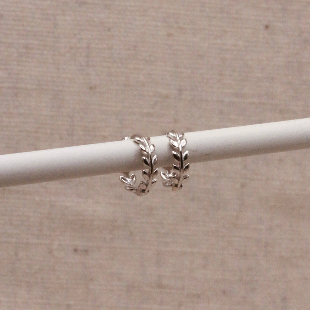 A pair of delicate laurel leaf huggies in silver. A jewellery box staple with a nature-inspired twist.