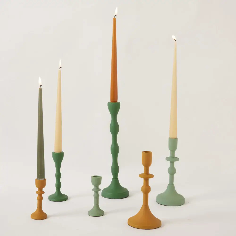 Multicolored metal candle holders. The pretty Solar candle holders combine a simple shape but have been reinvented with their wide range of stylish colours. They can be displayed alone or combined with other pieces from the collection, playing with bold ranges while creating different heights. They will add a distinctive and warm touch to your table or console.