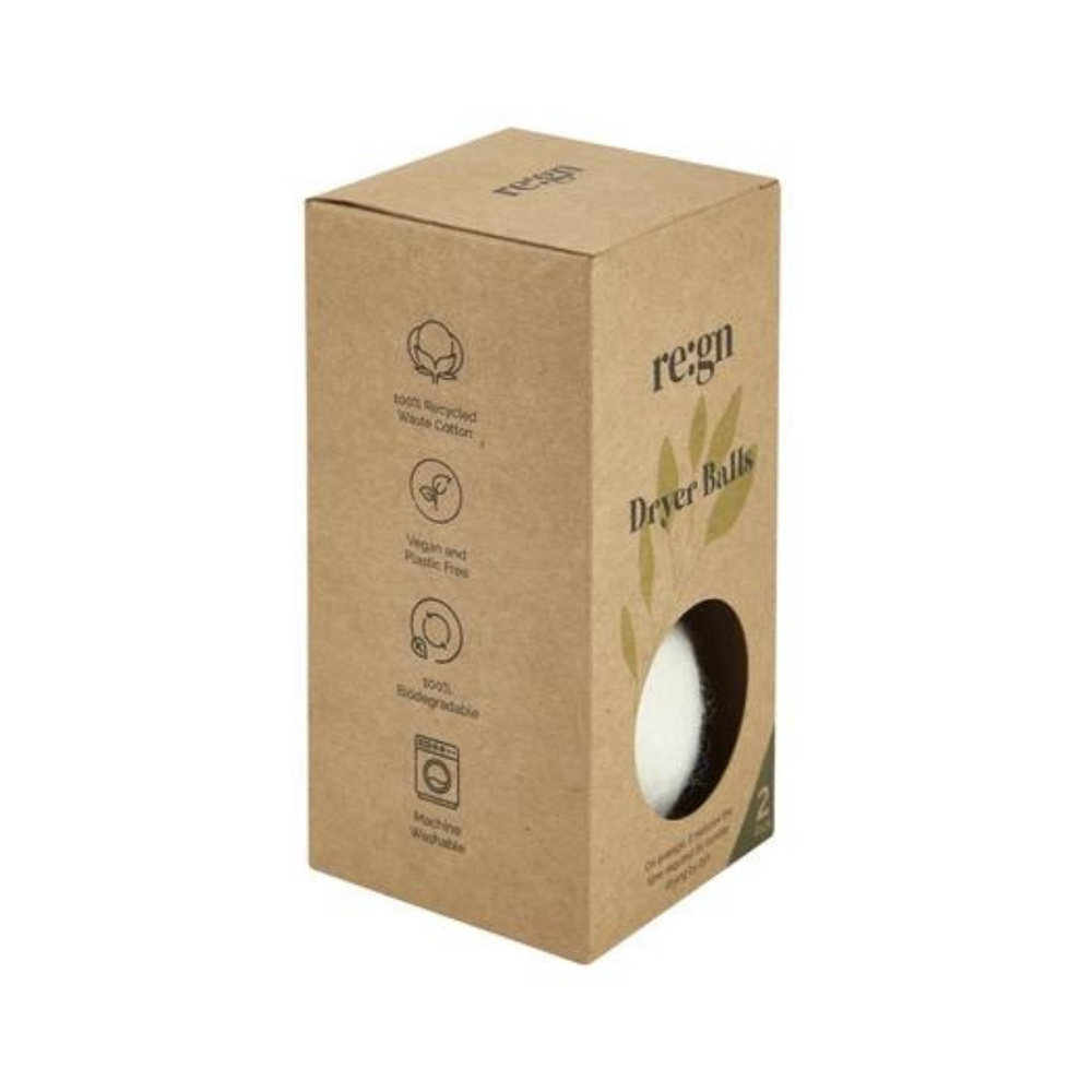 Crucial in these times of ever-increasing energy bills. Using dryer balls also saves your dryer from residues left from chemical fabric Re:gn's 100% plastic free dryer balls are made from organic cotton terry cloth and filled with 100% recycled waste cotton and will significantly reduce your drying times.