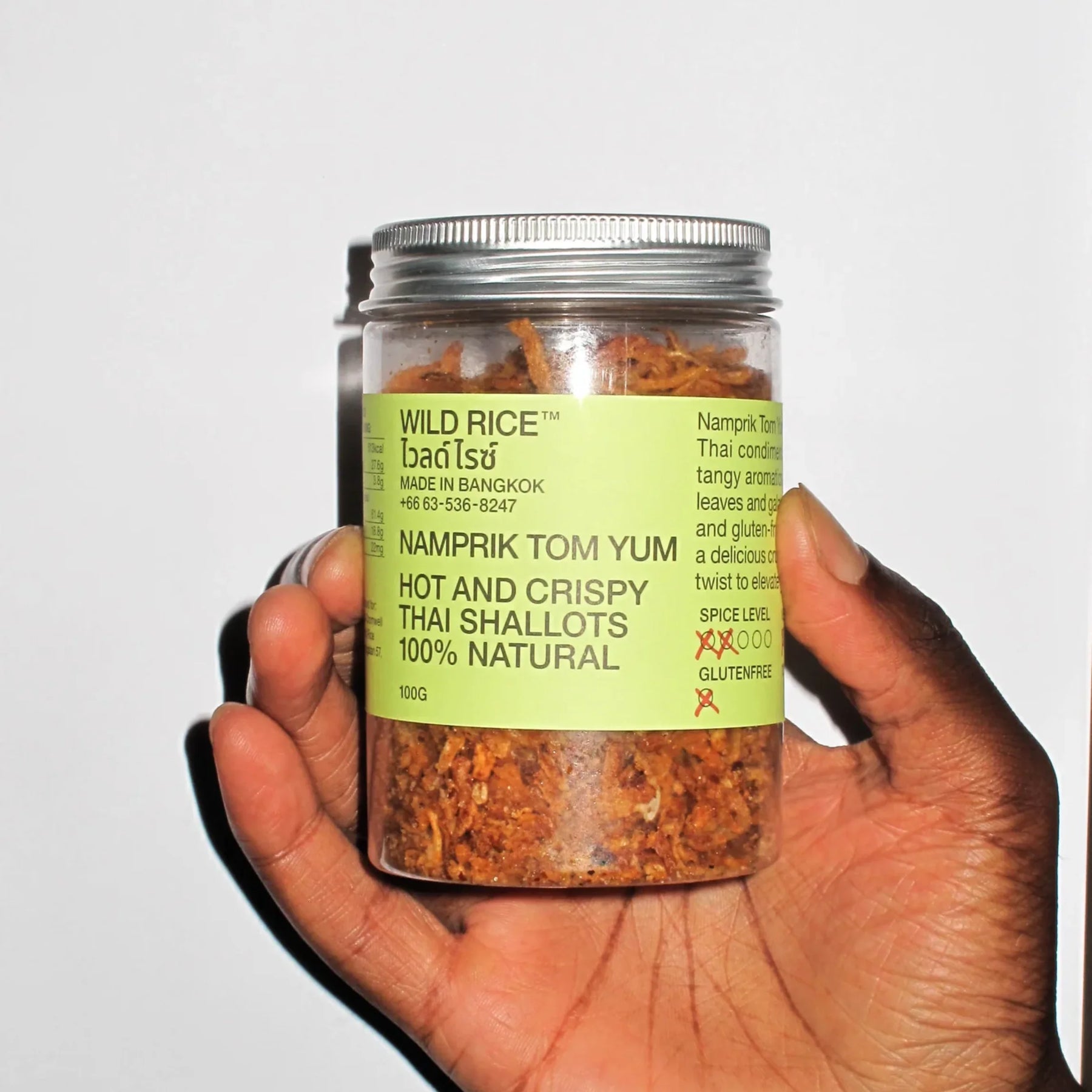 Tom Yum Flavour cripsy shallot. Strong aromas of kaffir lime leaves, lemongrass and fresh chillies