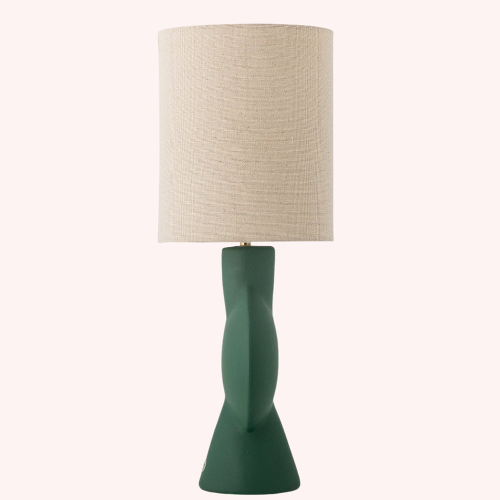 An unique stoneware lamp with natural linen shade. Wired with a linen cotton braided flex, which tailors the look of the lamp, complete with plug.