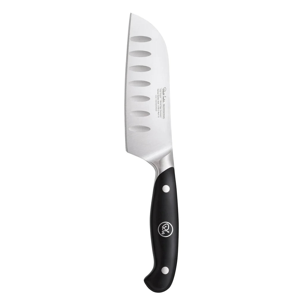 The precision sharpened Professional 12cm/4.5" santoku knife is an all purpose knife for slicing, dicing, chopping, and mincing. It can be used for meat, fish, fruit, vegetables, and herbs. The thin, scalloped blade reduces friction and helps to prevent food from sticking to the blade, allowing you to cut things more finely and precisely.