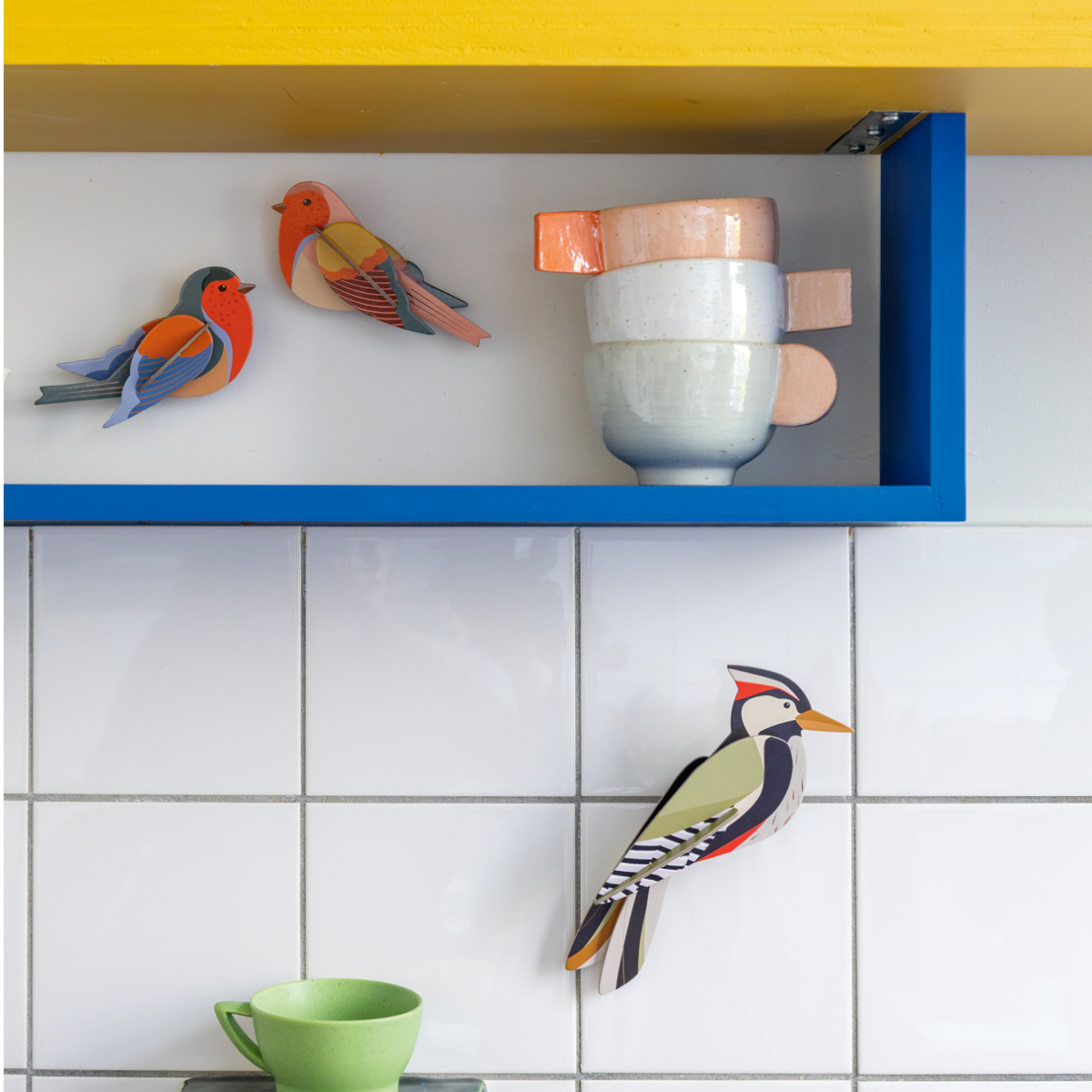 Garden birds chirp around us, pecking at some crumbs, glancing around, then fluttering away. They add color to our daily lives. These cardboard blue tits won’t fly away and can be given a lovely spot on your wall.