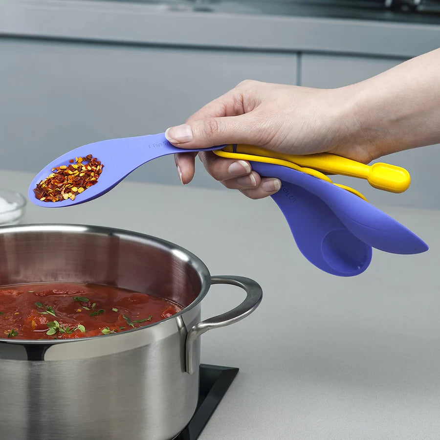 A set of five measuring spoons inspired by nature, dual colour crocus design spoon set. Each spoon features both imperial and metric references.