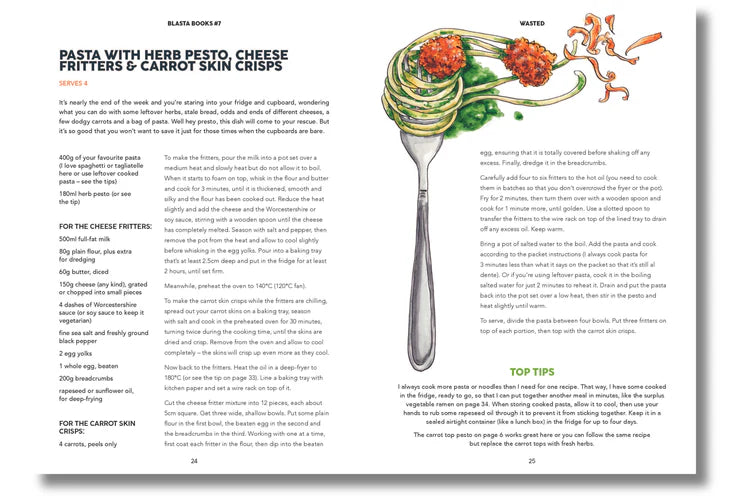 Blasta Books #7: Wasted is a capsule collection of recipes that have come from identifying some of the most wasted food items in our homes. This book will help you to stop wasting food and turn perfectly good ingredients into delicious dishes. And the key word here is delicious. The book's ulterior motive may be to get us to think differently about ingredients and waste, but the driver for all these plant-based recipes is flavour.