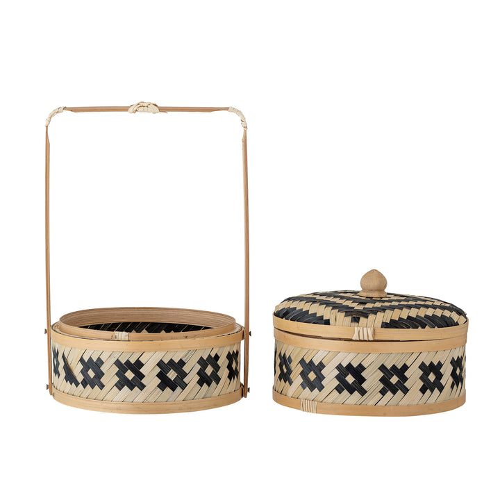 The Nian Basket with Lid is a striking Vietnamese basket made of seagrass in a natural colourway with added black motifs. The basket has a practical square handle and is very suitable for storing steamed food. Alternatively use as a decorative item anywhere around the home.